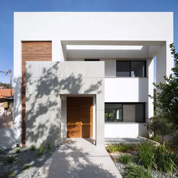 מבט מהחוץ אל עבר הכניסה לבית. מתאר קובייתי נקי עם גריעות המרככות את המסה, ושילוב סרגלי עץ בחיפוי הטיח. שער בנוי בתצורת האות ח' מסמן מעבר רך מחוץ לפנים.