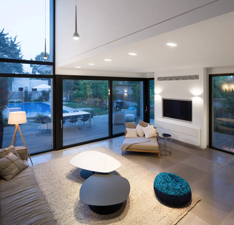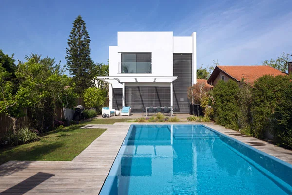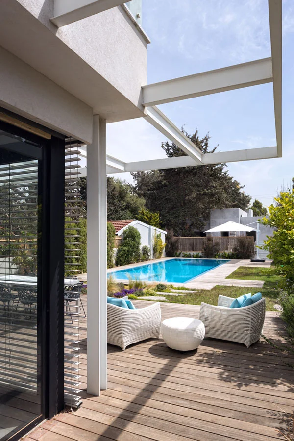 מבט מעומק הגינה אל עבר הבית שפתחיו הגדולים מעצימים את נוכחותה בחלל הפנים. חזותה המטופחת משלבת בריכה עם משטח רביצה מפנק, ריצוף דק עץ, חלקת דשא ורחבת ישיבה עם ריהוט גן מסוגנן.