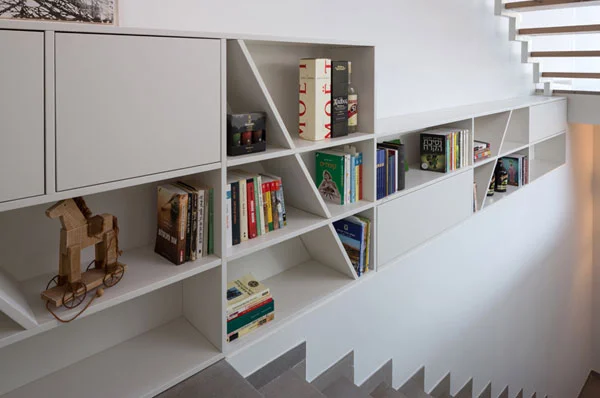 ממהלך המדרגות המוביל למרתף "מבצבצת" ספרייה צמודה לקיר התוחם אותו, כאשר לתוכן שתורמת נוכחות הספרים לחלל מתווסף עניין ויזואלי שמייצרים מיקומה ואופן עיצובה עם מדפים אלכסוניים. את תכנונה במיקום הלא שגרתי מסבירה וייזר כפתרון ארכיטקטוני ופונקציונאלי כאחד. "היות ומדובר במבנה שחציו השני הינו בית ישן נדרשנו לבנות את הקיר המשותף כקיר כלונסאות תומך, המייצר סוג של "מדף" בגובה הריצוף ובתוך גם הפרש עומקים בינו לבין הקיר. הספרייה היא, למעשה, ניצול של אותו "ריק" שנוצר בשל הפרש העומקים". מהלך המדרגות המוביל לקומה העליונה ממוקם לכיוון עומק החלל, ועמוד מתכת קונסטרוקטיבי הניצב בסמוך אליו מייצר סוג של חיץ מגדיר בינו לבין הסלון.