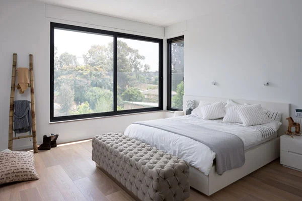 יחידת ההורים היא חלל מרווח שתכנונו משלב אזור מבואה נעים המכיל פינת איפור, וכן רצף ארונות המתחיל בשטחו וזורם לכל אורך החדר. עיצובו מאופיין באותם דיוק ואווריריות המאפיינים את קומת הכניסה, ופתח גדול שנקבע בחזית הפונה לגינה מאפשר להתבשם מנופה וממראה הבריכה גם כשנמצאים בקומה העליונה. חזותה המטופחת משלבת משטח דק, צמחייה ירוקה ובריכה בה נכלל משטח רביצה מפנק, וכשהיא עוטפת את הבית הנפתח אליה מחדד המרחב כולו את רעיון המעבר הרך שיצר השער בכניסה לבית ואת איכויות המגורים שהוא מעניק לדייריו - איכויות מגורים בסביבה שלווה המותירות את המולת העיר הרחק מאחור.