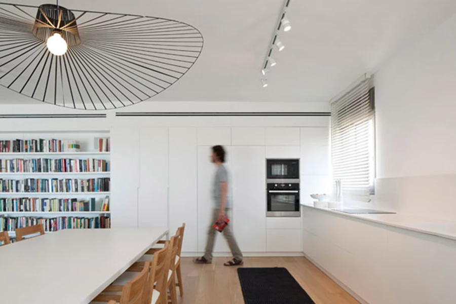 שפת החלל מינימאליסטית ובהירה, מעצימה את תחושת המרחב ובמקביל מייצרת תחושה עוטפת: קירות לבנים, נגרות לבנה בגימור צבע בתנור, תאורה כללית מעודנת המתקבלת מפסי צבירה עם נורות לד, וריצוף פרקט אלון הנוסך חמימות. הצמצום החומרי בא לידי ביטוי אף בשילוב פריטי הריהוט שנמנע מכל עומס מיותר, ולמעשה, נוכחותה של הספרייה היא אכן לב לבו של החלל, המוקד הדומיננטי במארג האוורירי, ובשלל כריכות הספרים הצבעוניות גם "ספק" הצבע העיקרי שלו. בחלל הפתוח, הנעדר כל מחיצות הפרדה, הגדרת האזורים השונים רכה, באמצעות פרטים מינוריים, אך כאלה שעושים את שלהם, ולו בתחושה. כך, למשל, שטיח יחיד בחלל שנפרש בפינת הישיבה, גוף תאורה בעל נוכחות מיוחדת המשתלשל מעל פינת האוכל, או "קפיצת מדרגה" קטנטנה שתוכננה ברצף ארונות המטבח והספרייה במיקום מדויק בו "מסתיימת" פינת האוכל, וכמו מכריזה/מסמנת שכאן, בעצם, "מתחיל" הסלון.