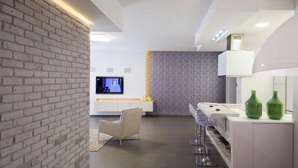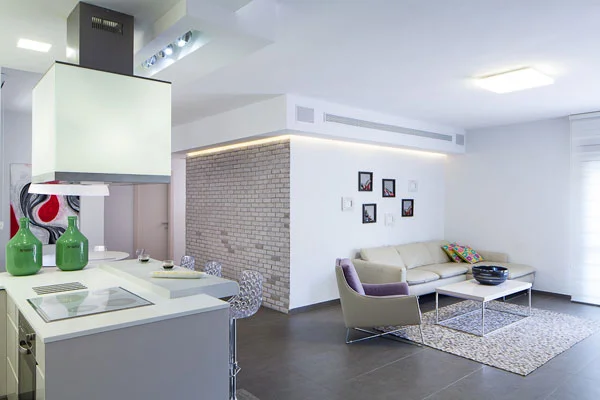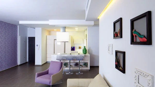 משחקי גבס ותאורה: | ברחבי הדירה נעשה שימוש באלמנטים מגבס משולבים בתאורה, היוצרים קומפוזיציות צורניות מעניינות ונקודות עניין. |