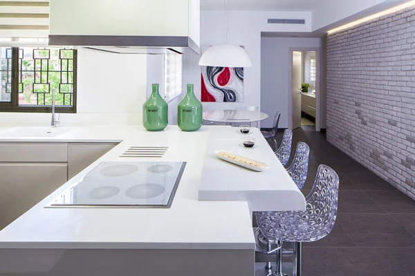 ארונות מטבח: | צבועים בשלייף לאק בשילוב עם שיש ודלפק מקוריאן, ההופכים אותו לאלגנטי וקליל בעת ובעונה אחת. קולט אדים פיסולי משתלב גם כגוף תאורה ואילו הדלפק הופך את המרחב למקום התכנסות משפחתי. שילוב כסאות בר שקופים מוסיף לתחושת הקלילות והצעירות. |
