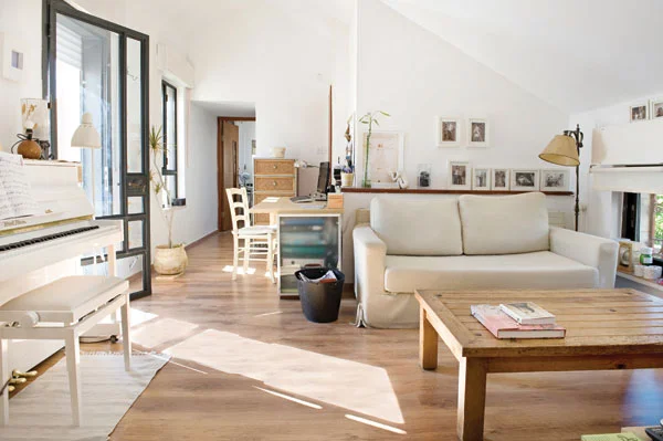 הסלוןמאחר והדירה כולה הייתה מרוצפת בריצוף טרצו ישן, הוחלט להקצות חלק מן התקציב לחיפוי חדש- פרקט, ועל מנת לחסוך בעלויות גויסה המשפחה המורחבת כולה למשימה של הנחתו, ולאחר שלושה ימים רצופים (ומעייפים) של זחילה על הרצפה, חיתוכים וניסורים, המשימה הוכתרה בהצלחה: כלל שטחה של הקומה חופה בעץ אלון משופשף שיצר ניגוד חמים לקירות שנצבעו בגון לבן-לבן המעניק אשליית גודל ומרחב. בשל גודלה של הדירה ניצול מקום היווה סוג של קוד מפתח, וכך אפילו שטחים "מתים" בתוך שיפועים לא נגישים הפכו להיות ארונות אחסון מצוינים, כאשר נוכח התקציב המצומצם במקום להשקיע בדלתות חדשות, נעשה שימוש בדיקטים להם חוברו צירים וידיות.
