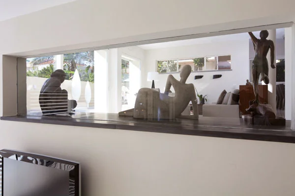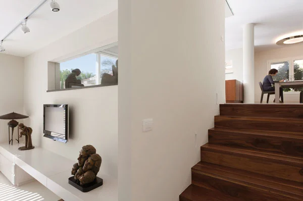 מרפסת קונזולית מרוצפתאזור הסלון ממוקם מהלך שלוש מדרגות נמוך ממישור הכניסה בו ממוקמים המטבח ופינת האוכל המופרדים זה מזה חלקית באמצעות מחיצה בנויה, שצדה הפונה למטבח מנוצל לשילוב מדפים ומסך טלוויזיה, דביר רותם: "חלוקה זו מגדירה כל אחד מאזורי החלל באורח נוח וברור מאד, ובה בעת היא מאפשרת מבטים "ארוכים" ומשמרת זרימה פתוחה". פינת האוכל והמטבח עטופים בפתחים המחדירים לחללם נוף ירוק, ובאזור המטבח אף תוכננה יציאה למרפסת קונזולית מרוצפת דק במבוק ממנה ניתן לרדת אל הגינה, ובהיבט הפרקטי- אף ישירות לפח ללא צורך לחצות את כלל החלל.