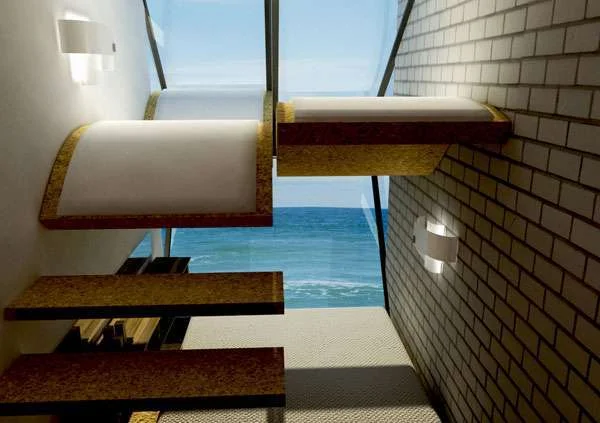 מלון ויפאסנה בתל אביב, הצעה לעיצוב חדרים בבתי מלון: אפרת מידן מערכת החלונות עוצבה בזוויות הללו כך שניתן לראות רק את האופק , בין אם זה הים או השמיים, ובכך לאפשר לאדם למדוט בחדרו , להתרחץ או לשבת בשקט ולהתבונן מבלי להרגיש את תל אביב הרועשת.