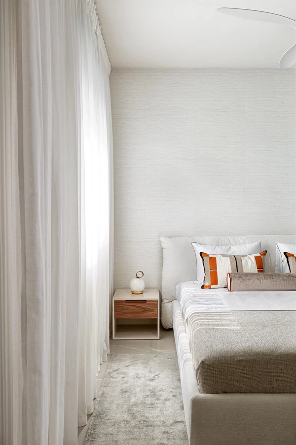 בחדר שינה העיצוב מינימליסטי, נקי ועדין, עם נגיעות של צבע כתום, לאור בקשת האישה. גב המיטה בחיפוי טפט נקי שנראה כאילו הוא חלק מהקיר.