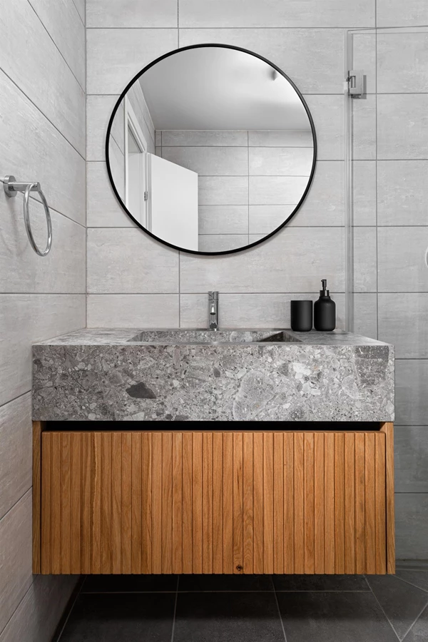 בחדרי הרחצה הארון מעץ והכיור בצבע אפור קר, שניהם משלבים בין הקר לחם, בין המודרני לטבעי.