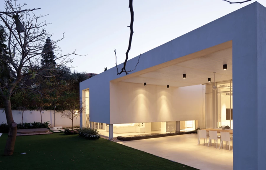 רחבת הישיבה החיצונית ביציאה מהסלון מקורה בפרגולה עשויה קורות אלומיניום זהות לאלה שבשער הכניסה, וחוברת לגינה, אשר כמו הבית פנימה, מאופיינת באסתטיקה "פשוטה” אך מוקפדת: חלקת דשא מטופחת, פה ושם עצים ותיקים ואדניות פורחות, ג’קוזי שקוע בקצה אחד של המרחב, ויחידת מטבח מאובזרת כראוי לבילוי בחוץ בצדו השני. כך, האורח המושכל בו שולב בונוס הקשר הישיר עם החוץ שמעניק בית צמוד קרקע עם קירות המספקים את מידת ה”עטיפה” הראויה להשגת אינטימיות, אכן מאחד את שתי המהויות לכדי חוויית חלל מזוקקת - "נטו חלל” כדברי קדם, ופשטות במובנה הטוב של המילה.