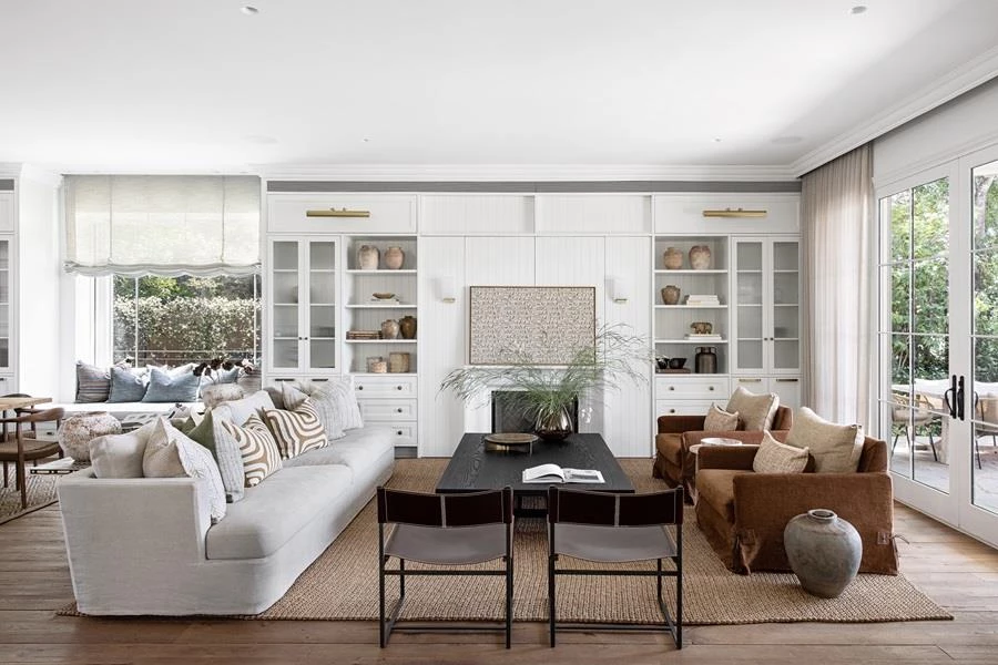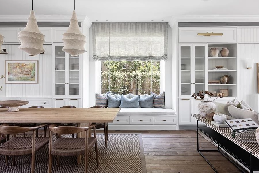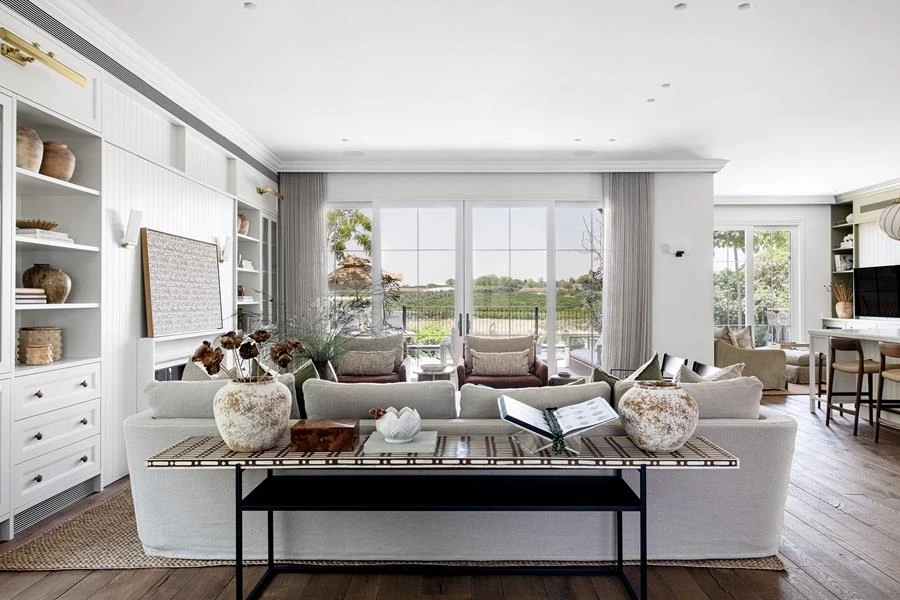 "הספרייה שברקע החלל משלבת בתוכה את מערכת המיזוג ושפע של מקומות אחסון לסרוויסים וכלי אירוח. היא מורכבת מחזיתות אטומות בגוון בהיר, גב מחורץ שמייצר רובד טקסטורלי נוסף וזכוכית גלית שמרככת את המסה האטומה. שילבנו בה הדגשים מפליז כדוגמת הידיות וגופי התאורה ובחלק המחבר בין פינת האוכל לסלון תוכנן חלון מפרץ- מוטיב נוסף אותו שאלנו מהאדריכלות האמריקאית המשמש כאתנחתא: זהו המקום עליו ניתן לשבת או להתפרקד, להנות מספר טוב ומתצפית על הגינה והנוף".