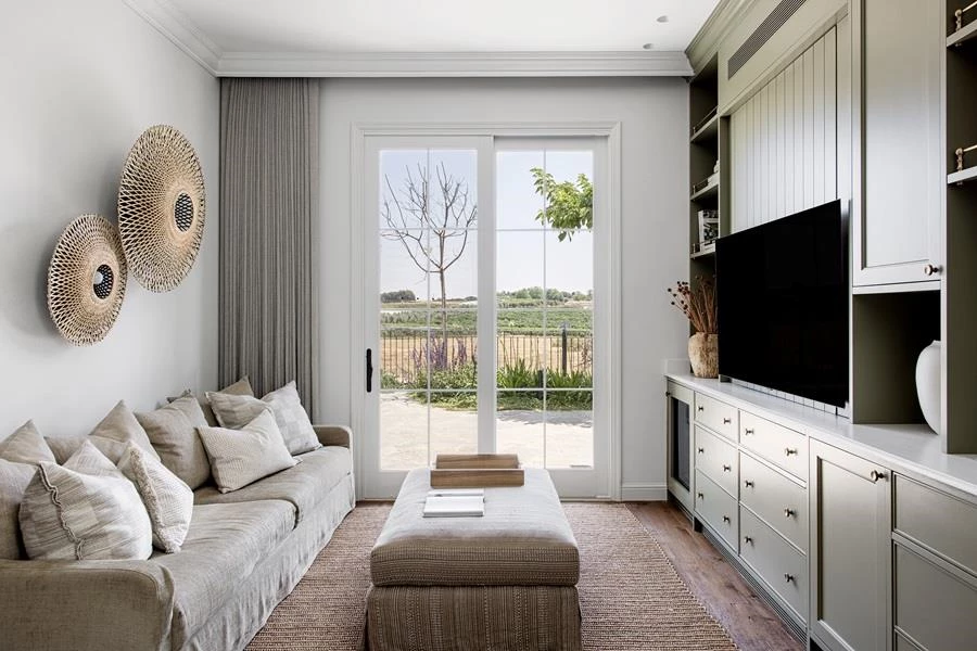 "בפינת המשפחה ניצבת ספה רחבה ופשתנית ובמקום שולחן קפה בחרנו לעבוד עם הדום שמייצר אווירה חמימה, קז'ואלית ומשפחתית. על גבי הקיר התקנו גופי תאורה שזורקים אותנו מעט לכיוון המראה האפריקאי השבטי ופתח היציאה מוביל אותנו כאמור לאזור המטבח החיצוני".