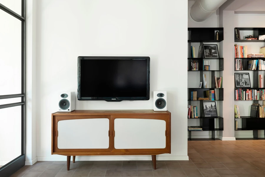 פרטי העיצוב המרכזיים- ספריית ברזל דו-צדדית, מערכת מיזוג חשופה תעשייתית, ריהוט וינטג'.