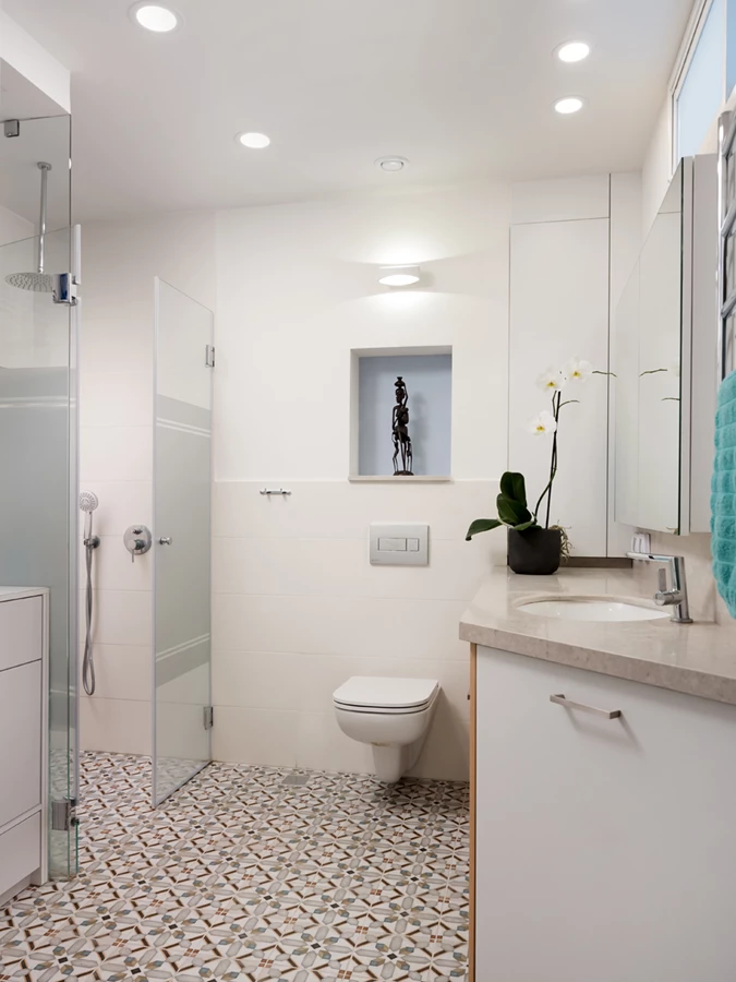 שרותי האורחים היו צפופים וסבלו מקירבה יתרה לסלון. בתכנון החדש הורחב חדר השרותים ונוספה לו כניסה נסתרת.