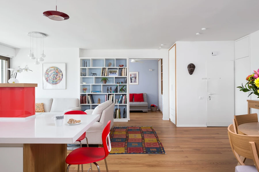 הפתרון האדריכלי לצרכיהם של הדיירים, הצריך חלוקה מחודשת של כל החלל. בהתאם לתכנון החדש, נהרס חדר השינה שהיה צמוד לסלון ובמקומו נבנה מטבח חדש. השינוי התכנוני יצר חלל ציבורי בעל מימדים ושינה באופן מוחלט את התחושה שמתקבלת כאשר נכנסים לדירה.