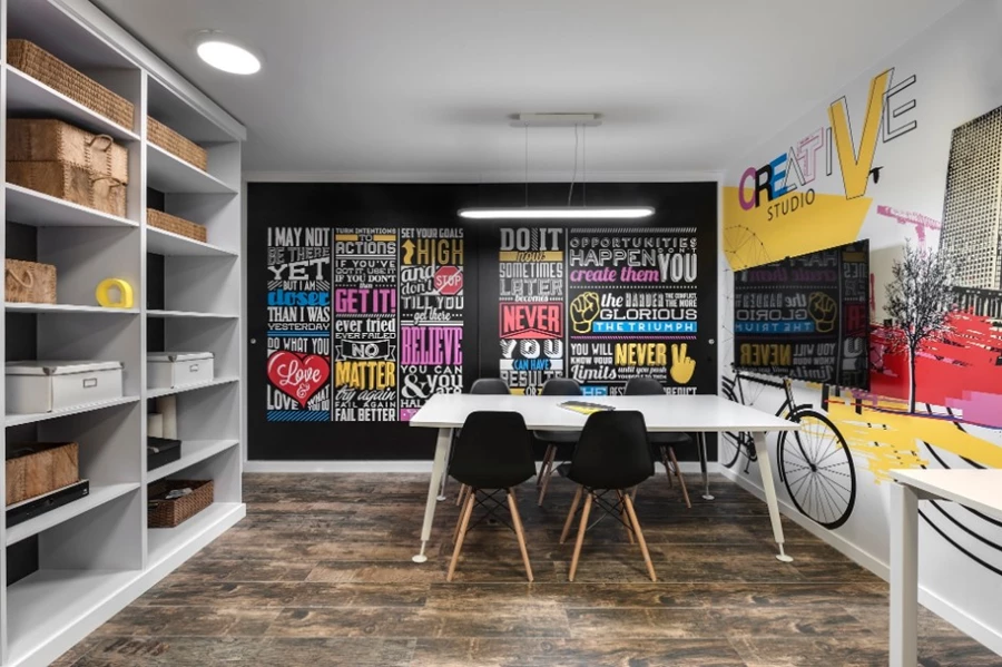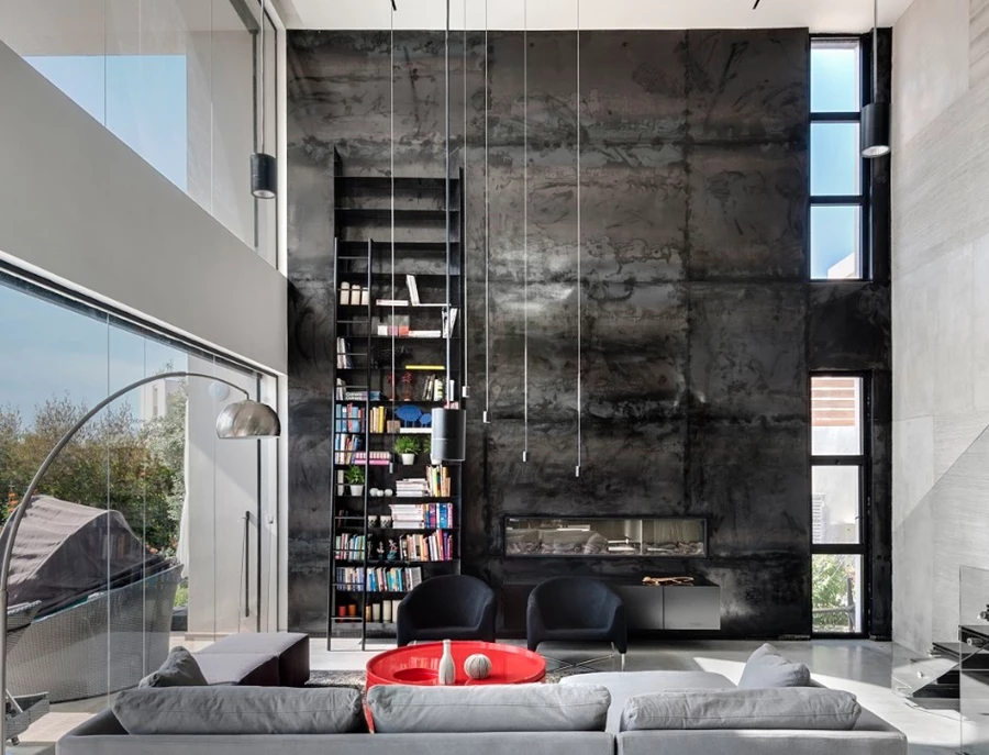 אותו מראה עוצמתי נשמר גם בסלון בו יצרו קיר במראה דרמטי מחופה מתכת בגוון טבעי ובהיותו כזה, מהווה FOCAL POINT שקשה להתעלם ממנו. הוא תוכנן בקומפוזיציה א-סימטרית ובו חלונות ורטיקליים צרים, ספריה ברזל שחורה מסוגננת וגבוהה במיוחד הכוללת ספרות ואקססוריז בגוונים עזים שמוסיפם עניין וצבע לחלל וביניהם קמין 'בילט אין'.