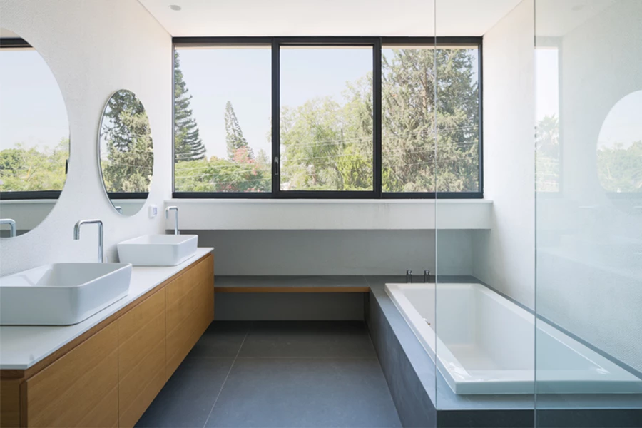 עיצוב תמציתי ומדויק גם בחדרי הרחצה בקומה העליונה: חיפוי באריחים במראה בטון, גווני לבן ונגרות עץ בהירה בקווים נקיים.