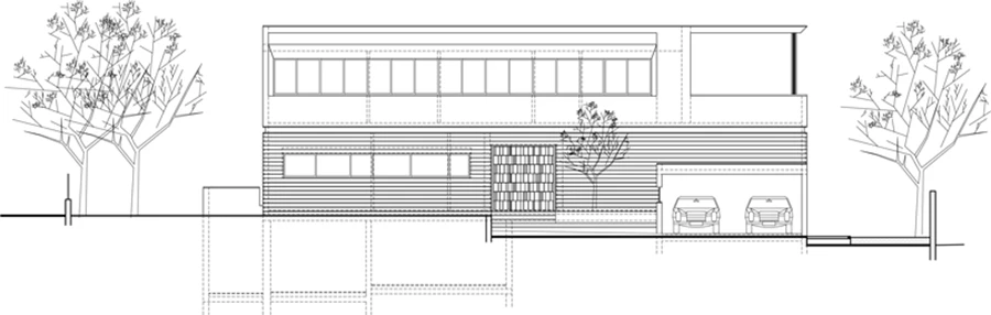 כלפי הרחוב השקט מציג הבית חזית אופקית ומאופקת הנחלקת לשתי מסות: התחתונה מחופה רצועות אופקיות של אבן צחורה והעליונה בחיפוי טיח לבן. בין השתיים מפרידה קורת פלדה לבנה, אשר בחזית האחורית משתחררת/מתנתקת מהמסה הבנויה והופכת לפרגולה גדולה. חלונות הקומה העליונה מתוכננים ברצף הנקרא כפתח אחד גדול הממוסגר אלומיניום שחור, ופרגולה בנויה מטויחת לבן הנתמכת על זוג עמודים עגולים, מסיימת את הרצף לכוון הבית השכן.