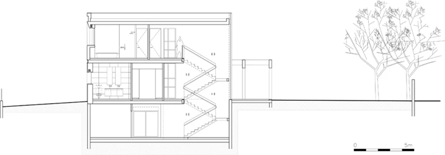 בניגוד לפשטות הגיאומטרית של התכנית, המורכבת מחללים ריבועיים ומלבניים נקיים, חתכי הבית, כאמור, מורכבים מאד, והקומפוזיציה המרחבית מייצרת חללים מרשימים עם הדגשה יתרה על ממדי עומק וגובה.