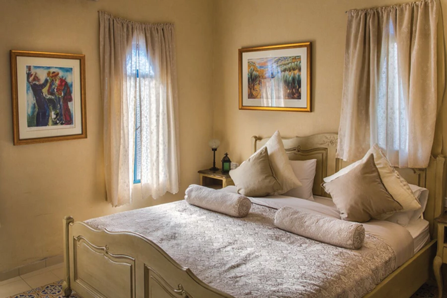 הסוויטות גדולות ומרווחות. הפתחים, הדלתות והחלונות עוצבו בתצורת קשתות, בסגנון מזרחי וכוסו ביד אמן בזכוכית ויטראז' צבעונית שהובאה במיוחד מירדן, בשילוב פרופיל ברזל אותנטי. לכל סוויטה אופי עיצובי שונה: כל אחת מהן נושאת את שמו של אמן צפתי אחר, ומטבע הדברים יצירותיו והביוגרפיה שלו מתנוססים בה- חלוואני, קסטל, רובין פרנקל וגוטמן. העיצוב הפנימי הוכתב מהקמרונות,הקשתות והכוכים הקיימים, ובקירות נעשה שימוש רחב בשימור מראה האבן הגלילית החשופה ושימוש חלקי בטיח ואלמנטים אוריינטליים ציוריים. פריטי הריהוט והתאורה לוקטו בכל הארץ בהתאמה סגנונית לאופיו של המקום, ובכל חדר שזורים כל אמצעי הפינוק והנוחות האפשריים: מסך טלוויזיה ענק, מערכת שמע, מטבחון מאובזר, מיטת ענק מלכותית, פינת ישיבה וקמין מסורתי, כשכולם מוטמעים בתוך המראה הכללי כחלק אורגאני ממנו. בד בבד עם ההקפדה על שמירת הפרטיות, בכל סוויטה קיימת גישה למרחב מרכזי עליון, המשקיף לנוף סמטאות העיר והרי הגליל הירוקים. מרחב זה כולל בריכת השחייה המחוממת, משטחי רגיעה ושיזוף, מטבח חוץ מאובזר עם מתקני בישול וצלייה, סאונה, חדר טיפולים ובריכת ג'קוזי חברתית. לעת ערב, עם בת/בן זוג, לבד או בין חברים, טובלים בג'קוזי ובספא או משתרעים על הערסלים, ולאור התאורה המעוצבת, עם כוסית של יין גלילי, מתמלאים בתחושת שלווה של בית ב"גג העולם".