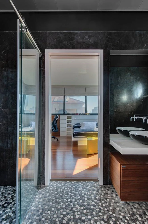 בגוש הנמוך שולב במעטפת השקופה גם חיפוי בסרגלי עץ לתוספת עניין אסתטי, וסוויטת השינה שמוקמה בקומת הקרקע נהנית אף היא מחצר פרטית מרוצפת אבן ג'ת בה משתלב גם משטח דק קטן לשהייה אינטימית וכן בריכת נוי הסובבת-מקיפה אותה. כמו בחלל הציבורי, כך גם בסוויטת השינה הקשר בין אלמנטים בעיצוב הפנים לשפה האדריכלית בא לידי ביטוי, כמו, למשל, גב מיטה מרופד וגבוה מהמקובל שתוכנן ככזה בהתאמה למיקומו של קיר חיצוני השייך למעטפת, והעיצוב ככלל, שהינו מינימליסטי בעיקרו, מאפיין גם את חדר הרחצה הצמוד. חדרי הבנים שבקומה העליונה רוצפו בפרקט נוסך חמימות, והם חולקים חדר רחצה משותף שרוצף באריחי פסיפס וחופה באריחי אבן בלו-סטון מגמה, כאשר פתח עגול שנפרץ בו מהווה סוג של אזכור לנוף הים הנפרש באופק הרחוק.