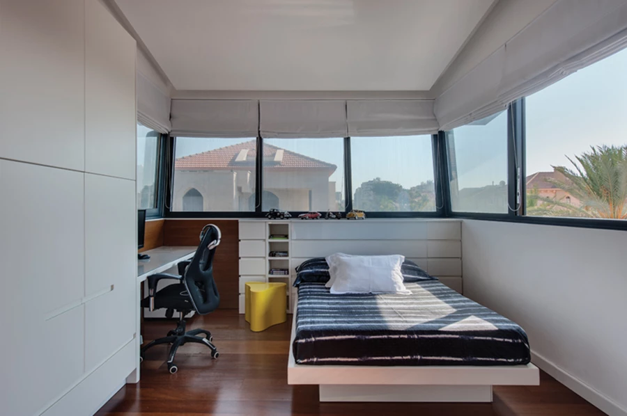 יחידת ההורים בקומת הקרקע של הגוש הנמוך נהנית מחצר פרטית משלה, ובכלל זה משטח דק לשהייה אינטימית בחוץ. עיצוב מינימליסטי הנקשר לאדריכלות: גב מיטה מרופד וגבוה מהמקובל שתוכנן ככזה בהתאמה למיקומו של קיר חיצוני המשתלב במעטפת.