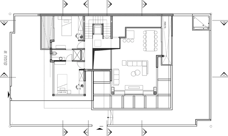 קונסטרוקציה אלכסונית הנפתחת כלפי מעלה כעין פירמידה הפוכה, משווה עוצמה ותחושת מרחב לחלל פנים הבית שתכננה האדריכלית נאוה יעבץ בדרום הארץ