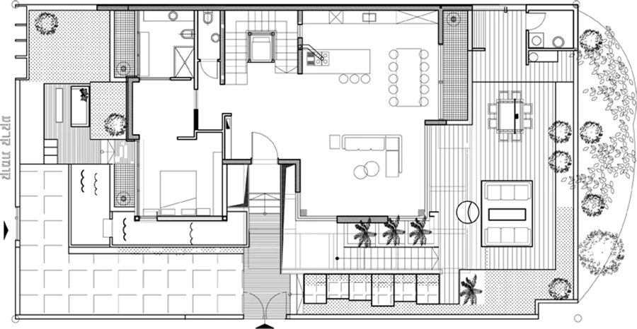 מהחלל הציבורי ישנה יציאה לחצר נעימה שחלקה הינו רחבה מרוצפת דק עץ המכילה שולחן אוכל נוח לאירוח ומקורה בפרגולה הסובבת את הבית ומותקנת על "קו התפר" בין קומת הקרקע לבין גלריית קומה א'. חלקה השני של החצר מרוצף באבן ג'ת בגימור מותז ושני המרחבים עטופים ברצועת צמחייה מטופחת, כאשר פארק סמוך אליו פונה הבית כמו מהווה המשך ויזואלי של הגינה: העצים השתולים בו נדמים כשייכים אליה, ונוכחותו ככלל היוותה שיקול בתכנון הצמחייה והתאמתה לצמחיית הפארק.