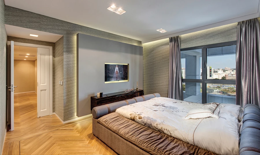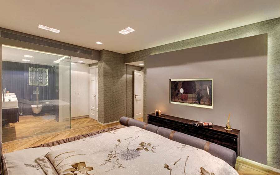 יחידת השינה: מחיצת זכוכית חכמה מפרידה בין אזורי השינה והרחצה: פני שטחה משתנים משקוף לאטום בלחיצת כפתור. מחיצת זכוכית: מקלחונט - רפי שפירא.