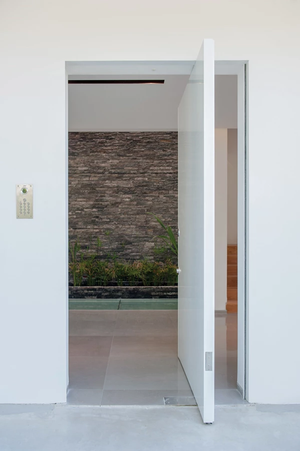 מבואת הכניסה שבצד הבית: דלת בגימור צבע לבן מבריק נפתחת ב-90 מעלות, וחושפת את הפטיו שבמרכז החלל.