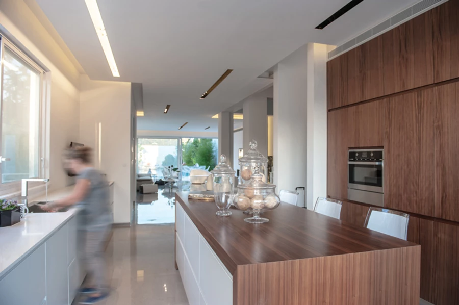 המטבח שמרפסתו הקדמית שוטפת אותו באור ואוויר, הוא חלל מרווח ונוח ממנו ניתן לפגוש במבט את הסלון ואף את הגינה האחורית. עיצובו משלב חזיתות שלייף בגון אפור בהיר מאד עם עץ אלון מגוון בחזיתות יחידת ארונות גבוהה ועוטף גם את יחידת האי המרכזית שמשמשת לאחסון וכשולחן אוכל.