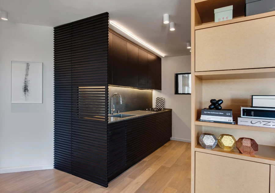 גוש ה-MDF 'מסתובב' וגולש לחלל המטבח, בו הוא מהווה חלק מהארונות הגבוהים ומכיל מכשירי חשמל אינטגראליים.