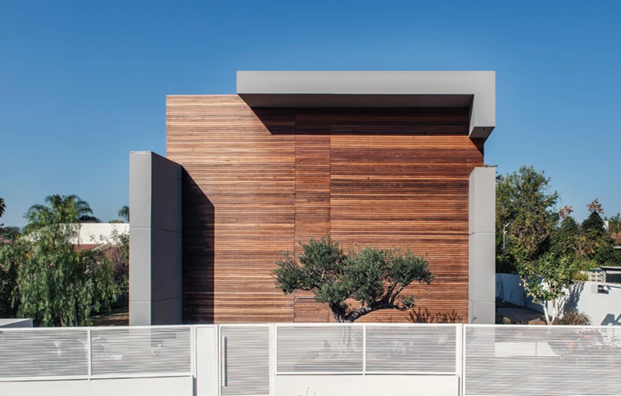 החזית הקדמית: חיפוי בסרגלי עץ איפאה בהתקנה סמויה ומסגרת בטון העוטפת את המבנה ב"קטעים". דלת הכניסה נטמעת בתוך חיפוי העץ כחלק בלתי נפרד.