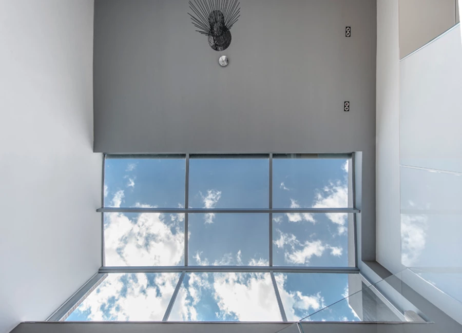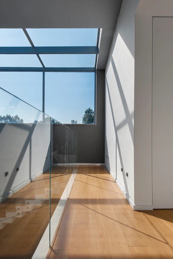 פתח האור בקיר ממשיך כקירוי חלקי שקוף של המעבר בקומה העליונה ושוטף אותו באור יום. פרקט אלון המשמש לריצוף הקומה מייצר רצף טבעי עם מדרכי העץ של גרם המדרגות המוביל אליה.