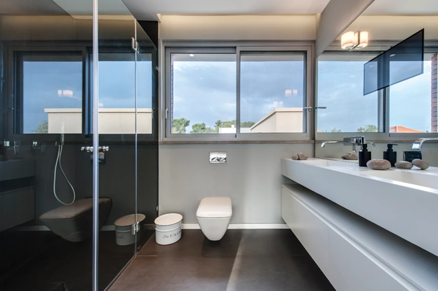 יחידת ההורים: מרווחת וצופה אל הבריכה שבגינה. חדר הרחצה המפנק שנכלל בשטחה מרוצף באריחי גרניט פורצלן דמויי בטון, ומשטח יחידת הכיור עשוי קוריאן בו משתלבים אינטגראלית שני כיורים. מחיצות המקלחון עשויות זכוכית שחורה ובמראה מעל היחידה מוטמע מסך טלוויזיה.