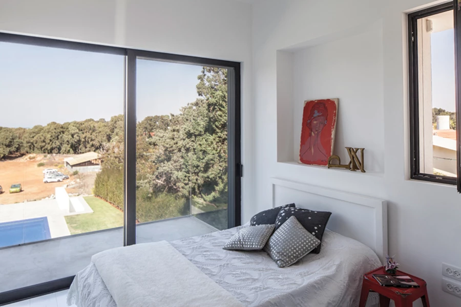 מרחב החוץ הנפרש לעין מהאזור הציבורי משתפל קלות בקצב נעים ומעניק תחושת אינסוף כלשהי. ביציאה ממנו ישנו דק עץ המשמש כרחבת ישיבה, שממנה ממשיך השטח "לרדת" אל רחבה מרוצפת בקדמת בריכת שחייה שתכנונה כבריכת גלישה מייצר משטח כחול שלאחריו משתרע מרחב טבע ירוק. אלה, למעשה, הם כתמי הצבע העזים ביותר בסיפורו של הבית שגובש ונארג בהתאמה מדויקת לצרכי דייריו ולהעדפותיהם האסתטיות, ואכן מגלם מפגש של קומפוזיציה ופונקציונאליות- בית "של שקט", שאור טבעי מהווה בו חומר לכל דבר וגונו הלבן אך מעצים את איכויות חלליו ואת נוכחות הסביבה הכפרית.