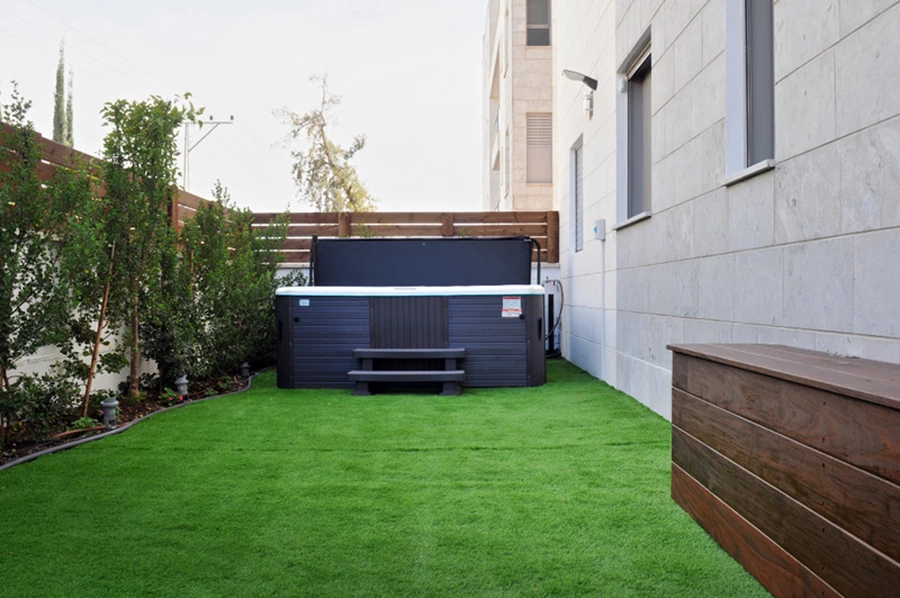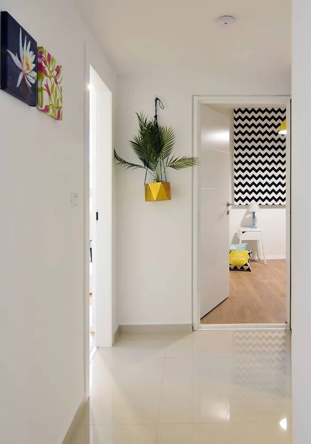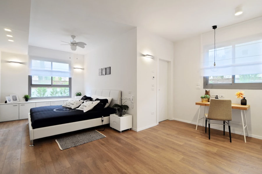 דירת הגן נרכשה בשלבים הסופיים של הבניה כשהיא מחולקת לחמישה חדרים. לצורך התאמתה ליעודה כדירת נופש מרווחת ואטרטקיבית הוסרו חלק מהקירות, והתכנון המחודש כלל תוכניות חשמל ואינסטלציה מותאמות. חדרי השינה חופו רצפות עץ חמימות, ולאזורים הציבוריים נבחרו אריחים גדולים ובהירים ליצירת תחושת חלל אורירית ואלגנטית.
