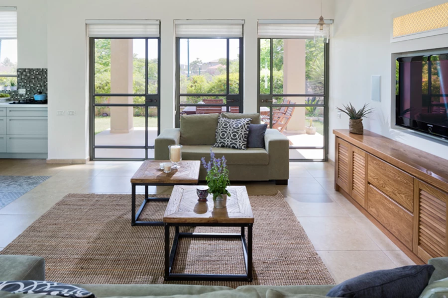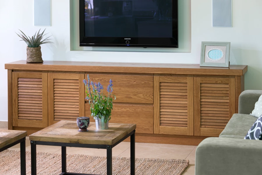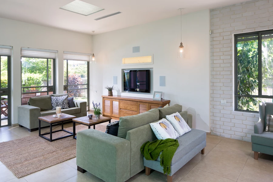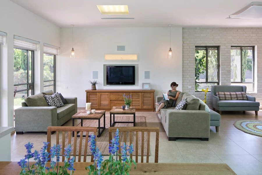 על מנת להעצים את תחושת המרחב והזרימה בין החללים השונים הוחלט "לחלק" את השטח באמצעות חומרים ולא באמצעות קירות. הקיר בין המטבח לסלון נהרס, מיקומה של הטלוויזיה שונה לקיר חיצוני וכיוון הישיבה בסלון שונה בהתאמה. קיר הטלוויזיה המעוצב נבנה בגבס ומצניע בתוכו רמקולים שקועים, גוף תאורה ואת כל מכשירי החשמל בשידת עץ מלא שעוצבה ייעודית בהתאמה אישית. מעל הטלוויזיה נתלתה משרבייה שתוכננה כגוף תאורה וכפריט עיצובי, ומשני צידיה נתלו גופי תאורה עשויים זכוכית ועץ המפיצים תאורת אווירה נעימה ורגועה. המשכו של קיר הטלוויזיה חופה אבני סיליקט והוא מגדיר ותוחם את פינת הישיבה החדשה. שילוב החומרים השונים לאורכו של הקיר איפשרו גם חלוקה ופרופורציות שונות לחלל: במקום שני חללים שווים בגודלם כפי שהיו פינת האוכל והסלון לפני השיפוץ, השתנתה חלוקת הקיר לשליש ושני שליש בהתאמה, והתחושה שהתקבלה היא של סלון גדול יותר.