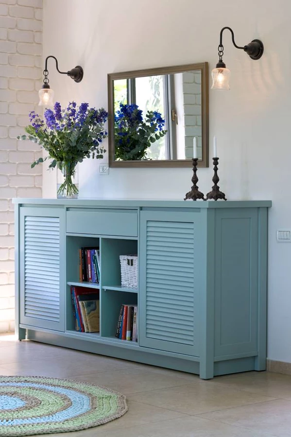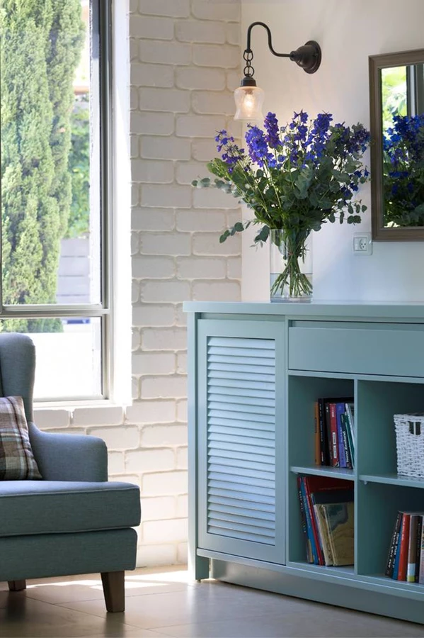 קיר "הגבוהים" במטבח, שאכלס את המקרר, המזווה ויח' הבילט אין נהרס ונבנה מחדש תוך מיקום כל הפונקציות במישור אחד, מעל המקרר שולבה יחידת ארונות נוספת, וחלון קטן ולא שמיש בוטל לטובת אחסון מכשירי חשמל קטנים עם תריס שמצניע אותם. במקום גון הוונגה הכהה נצבע המטבח בגוון אפור חם ועדכני כאחד, שמשתלב עם שאר הרהיטים והפריטים בבית. במקומה של פינת האוכל ובהמשך קיר הסלון תוכננה פינת קריאה נעימה, בה מוקמה שידה גדולה בגוון תכלת המשמשת לאחסון ספרים וכיחידת שרות כאחד, ולצידה מוקמו ספה והדום נוחים לפינוק המשתמשים.