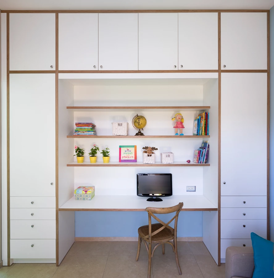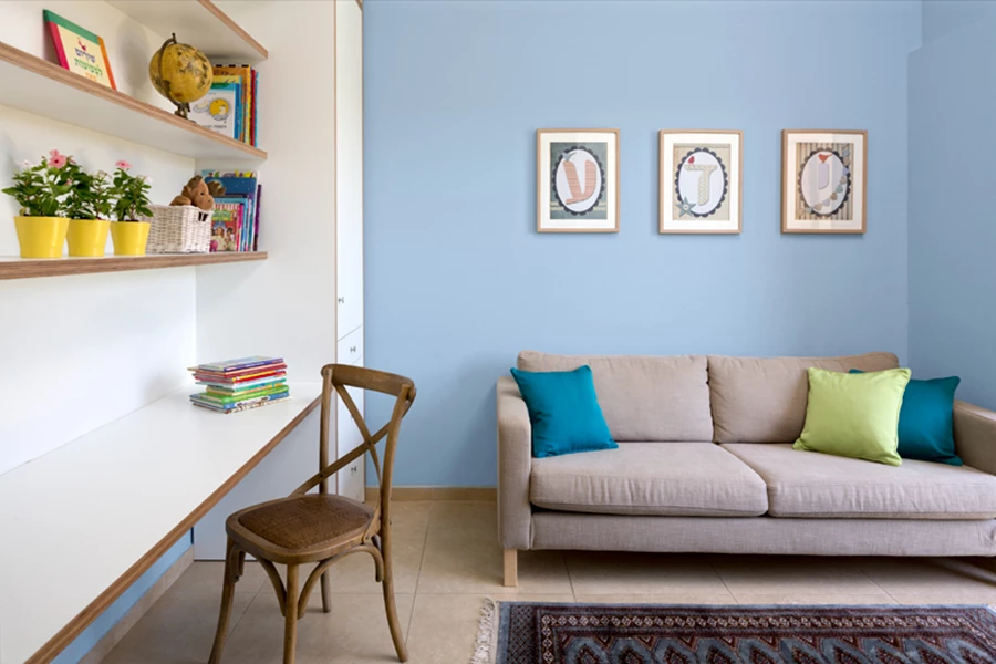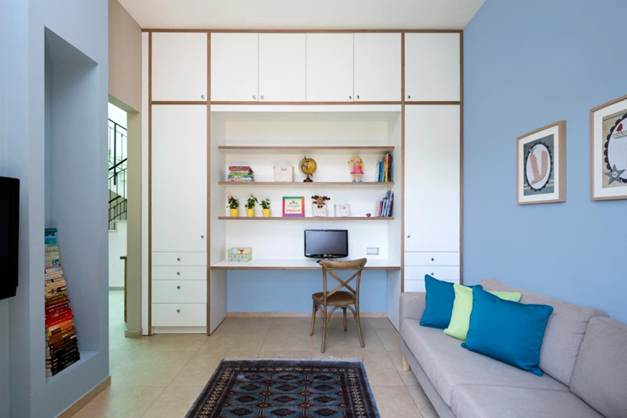 חדר המשפחה תוכנן לשמש את הילדים להכנת השיעורים, לצפייה בטלוויזיה ולמשחק, ועוצב בהתאם: יחידת ריהוט גדולה ומרשימה ששולבה לכל אורכו של החדר, תוכננה כך שהיא כוללת חללי אחסון רבים וכן שולחן כתיבה עם 3 מקומות ישיבה. למרות גודלה וגובהה המדפים פתוחים מעניקים לה מראה קליל וצעיר, כאשר ספה בגווני הבג' וקירות בגוון תכלת עמוק משלימים את חזות החדר עם תחושה של שלווה ורוגע.