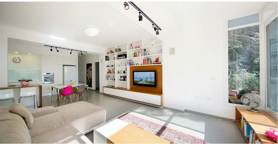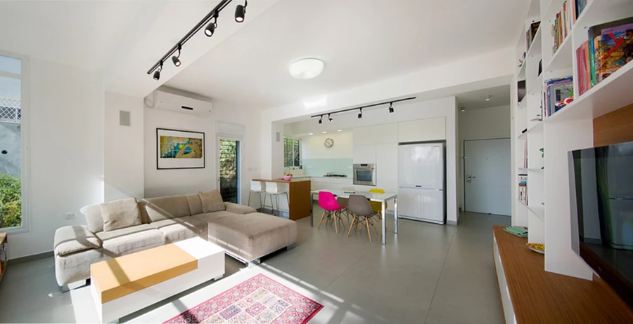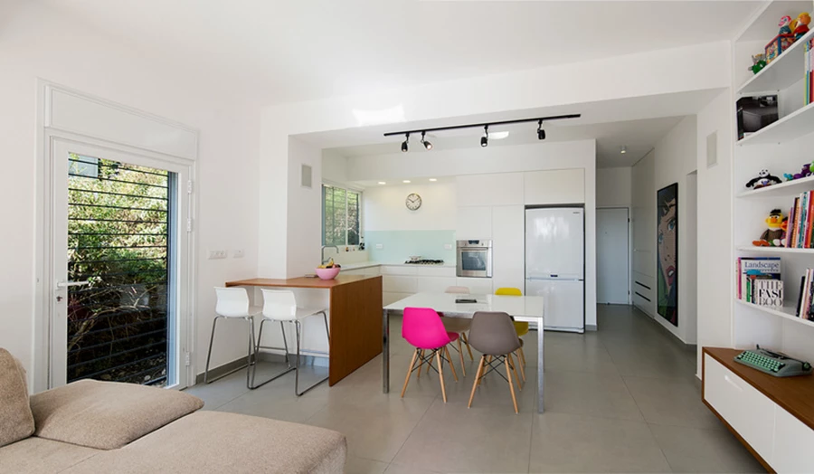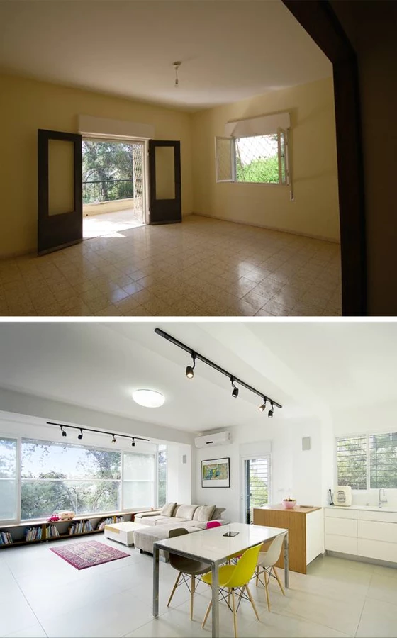 לפני אחרי - "המרפסת עצמה נסגרה בזכוכית, ושטחה התווסף לחלל המגורים המרווח שמכיל כיום סלון, מטבח הכולל דלפק ופינת אוכל."