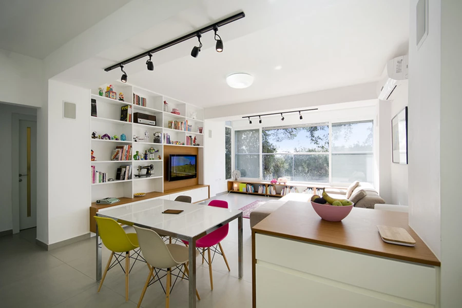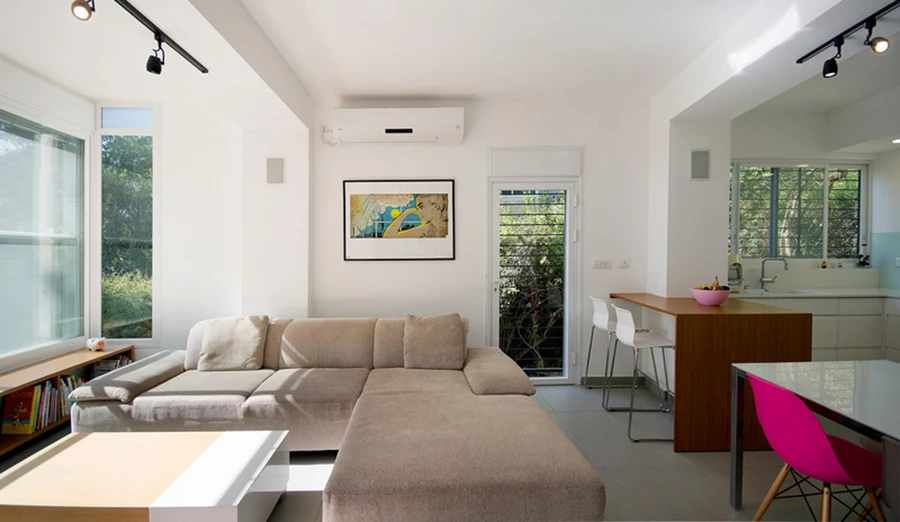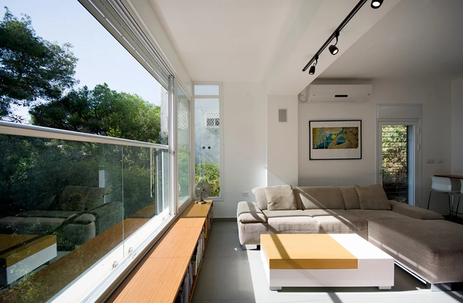 הקיר המסיבי שהפריד בין חלל המגורים הקיים לבין המרפסת החיצונית הפתוחה ומנע כניסת אור לדירה, נהרס, המרפסת עצמה נסגרה בזכוכית, ושטחה התווסף לחלל המגורים המרווח שמכיל כיום סלון, מטבח הכולל דלפק ופינת אוכל.