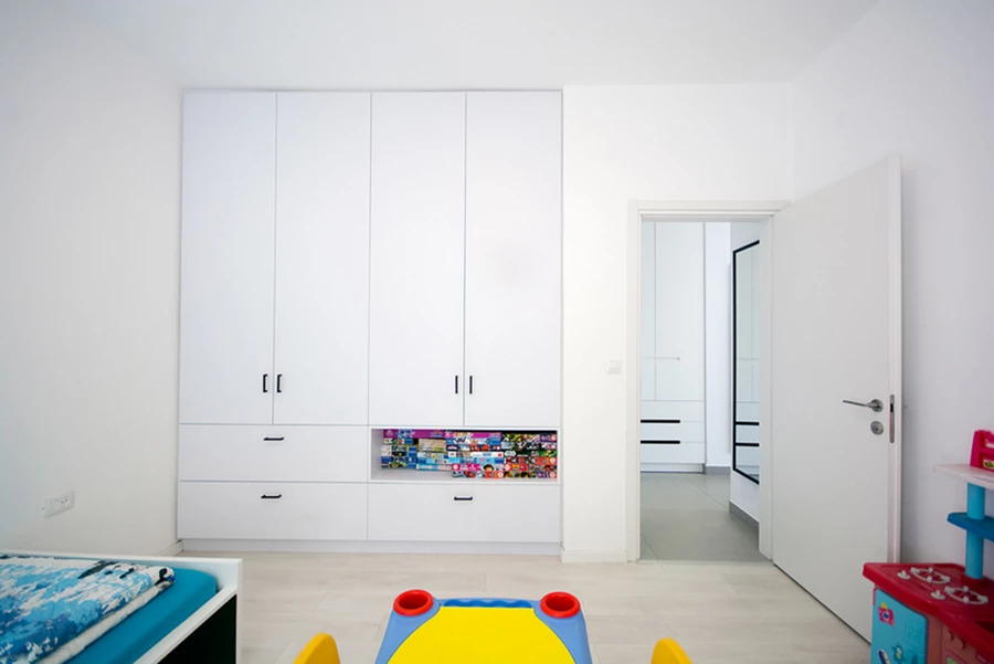 חדר הילדים. ארון הקיר משלב ארון בגדים עם מגירות לצעצועים ומדף לאחסון משחקים או ספרים.