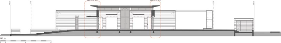 מבט מבחוץ אל אחד הפרקים השקופים שמחברים בין יחידות הבית.