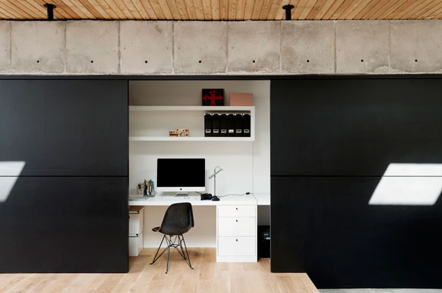 החלל הציבורי בקומת הכניסה גבוהת התקרה שממוקמת בקוביית הבטון. תחום בקירות הבטון החשופים וזורם במבנה מפלסים המגדירים את אזוריו השונים. מפלס הסלון מרוצף בבטון מוחלק, ומפלסי המטבח ופינת האוכל בפרקט עץ. ה"קיר" השחור הנראה מימין אינו אלא דלתות הזזה המשתלבות בקו אפס עם קיר הבטון וסוגרות על חלל משרדם של בעלי הבית.