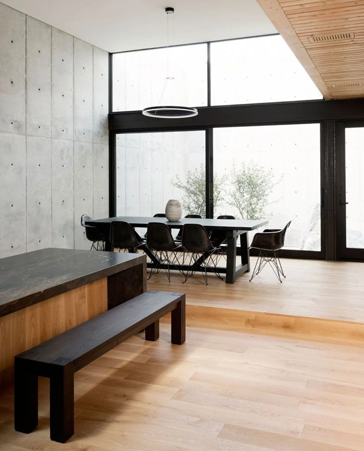 עיצוב נקי-מינימליסטי המשלב יחידת אי ארוכה עם ספסל "פשוט" למראה, ומשטח עבודה הממוקם בתוך מעין נישה בקיר. יחידת הנגרות המכילה את הפונקציות הנדרשות נמשכת כרצף ישיר מחלל הסלון.