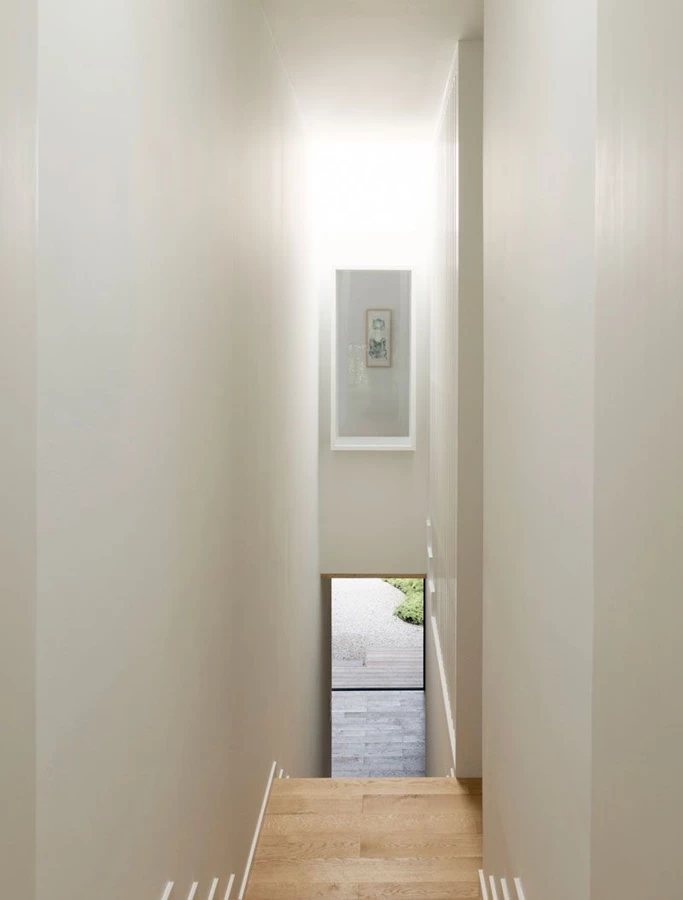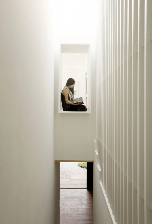 גרם המדרגות המחבר את קוביית הבטון עם קוביית העץ העליונה שמכילה את חדרי השינה והמשפחה/ספרייה. הקיר התוחם את חלקו התחתון "מתחלף" במחיצת סרגלים אנכיים המאפשרת יצירת קשר עין עם הקומה העליונה.