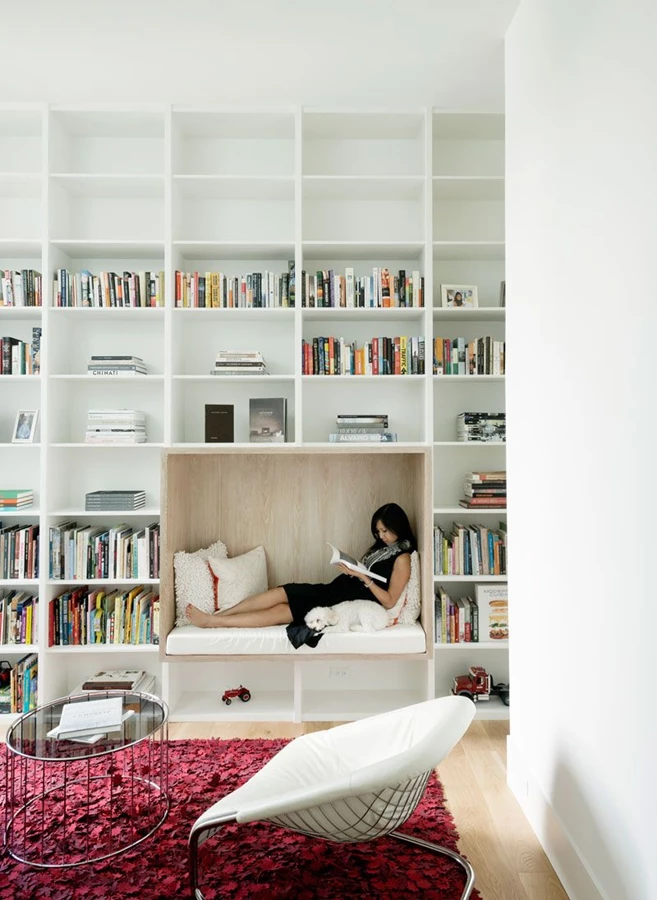 חלל המשפחה/ספרייה בקדמת הקומה העליונה: עיצוב מודרני אנין, ויחידת ספרייה בעבודת נגרות שבתוכה משתלבת מעין גומחת "השתרעות" להתרווחות נינוחה.