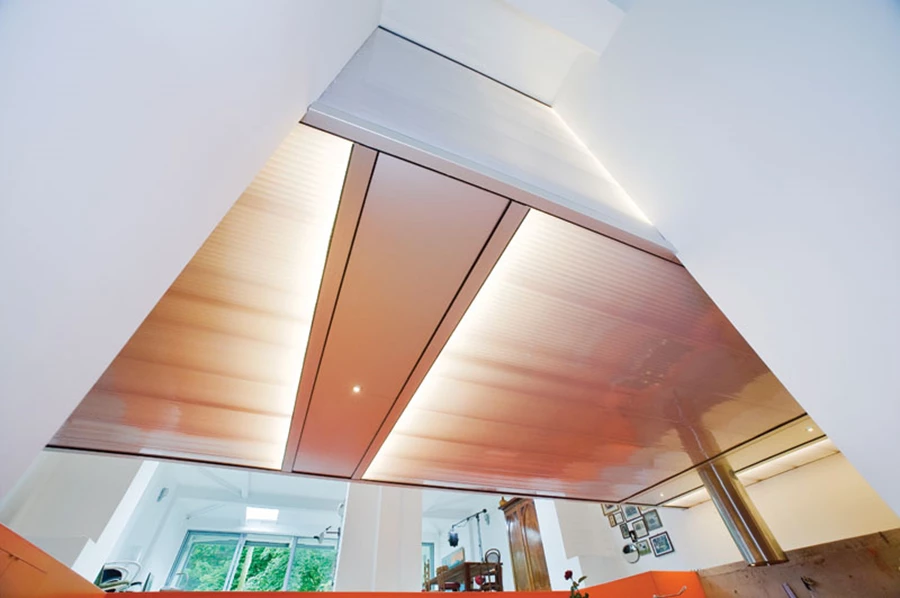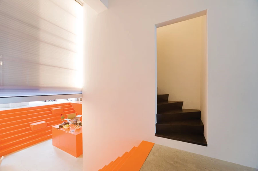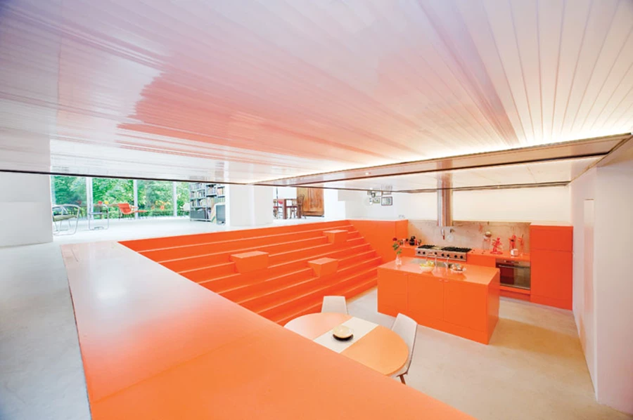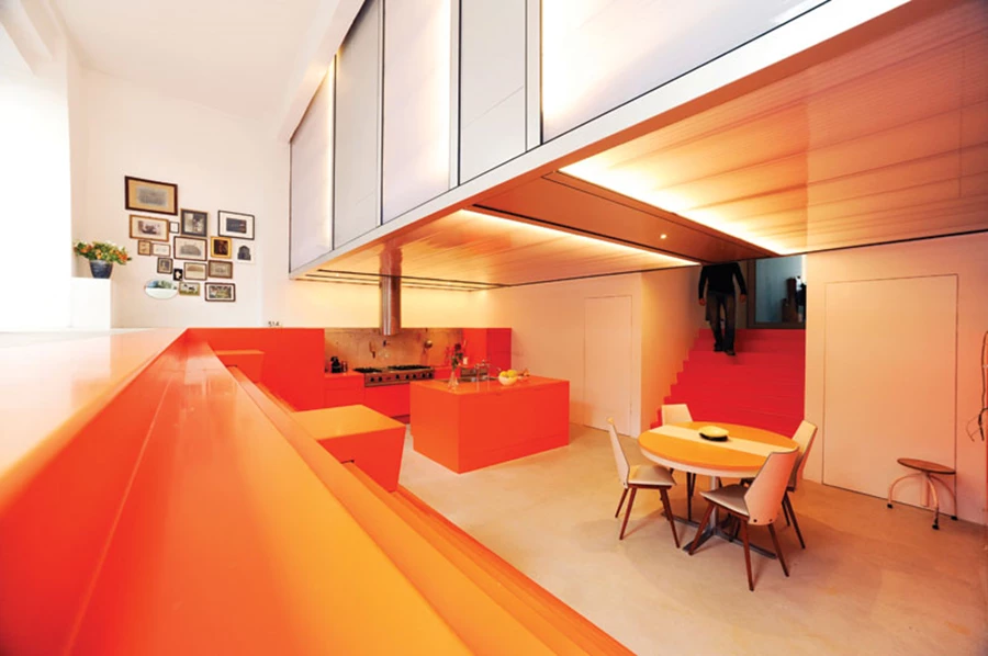 במרכז החלל נחפר מפלס תחתון המשמש כאזור האוכל והמטבח וכולל משטח עבודה, ארונות אחסון, את מכשירי החשמל, וכן פינת ישיבה מרווחת. את המטבח מקיף גרם מדרגות שנבנה במיוחד וחופה בפורמייקה בגוון כתום בוהק, כאשר לאורך המדרגות מפוזרות קוביות ניידות המשמשות ככיסאות וכשולחנות מזדמנים במידת הצורך. מעל המטבח שוכנים חדרי השינה הנראים כקופסה תלויה מעל, ורצפתם העשויה מפרספקס ומעוטרת בנורות לד מייצרת לו מעין תקרה מלאכותית. נורות הלד המשתלבות בה מאירות את כל החלל, וכל מופעה מהווה נקודת מיקוד של כלל החלל ומייצר אפקט של דרמה.