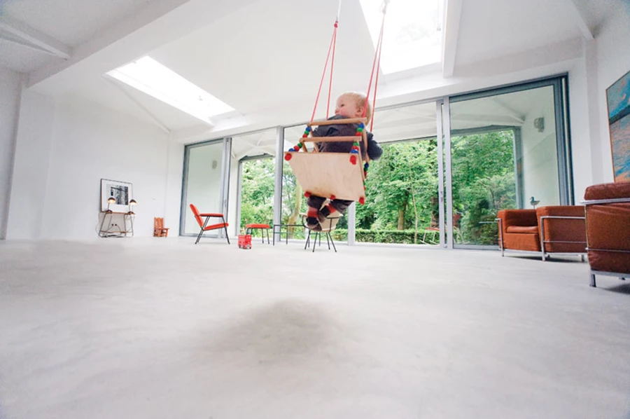 בכל רחבי החלל נשמרו רצפות הבטון המקוריות שפני שטחן הוחלק והן מעניקות לו את הטאצ' התעשייתי לצד הידור וסטייל יוקרתי. במפלס הקרקע ממוקמת פינת ישיבה גדולה הפונה לפארק, ומחוצה לה פטיו נרחב שאף הוא עשוי מבטון וגובל בפארק הצמוד. אזור ישיבה נוסף, שמופרד על ידי קיר ופתוח למרכז הבית, נמצא בסמוך לחלל המרכזי, וככל שעולים מתוך המפלס התחתון נגלה בהדרגה הנוף המרהיב שבחוץ.