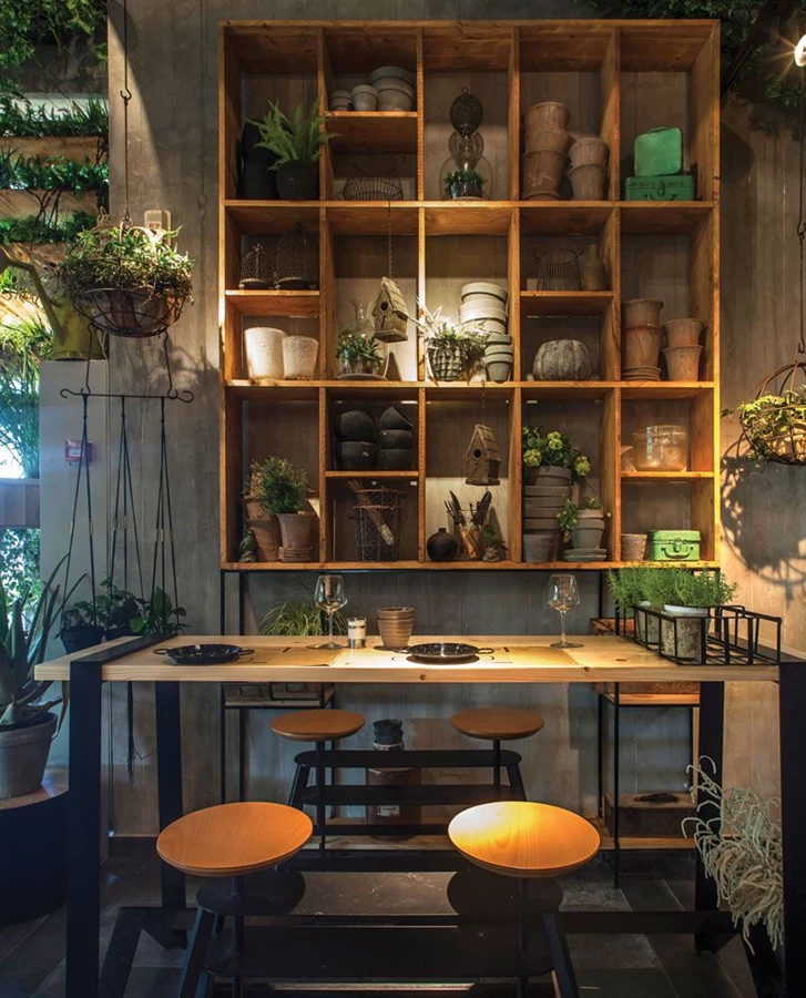 נוכחותם של הבר ומטבח הקינוחים החשופים לעין הסועדים היא חלק דומיננטי ובלתי נפרד מהתרחיש המגונן-גנני, כשהם מאובזרים במיני ציוד וחפצים טיפוסיים המתקשרים לתמה של סביבת חממה- קופסאות, אריזות, מזמרות וכד', ופריטי הריהוט, שמרביתם עשויים עץ, מציגים מבחר עיצובים א-פורמאליים כשירת הלל לכנות החומר: שולחנות מעץ שעבר תהליכי טיפול כהתזת חול, שטיפה ועוד להשגת מראה מיושן, כסאות בעיצובים שונים, או ספסלים עשויים מגושי עץ מלא עם תמיכות ברזל. גם חלל השירותים עוצב כקאסטם מייד עם צינורות וברזים במראה תעשייתי המזכיר ברזי גינה, ובחצר ממתינה לילדי הסועדים הפתעה נוספת בדמות פינת משחק תחומה כנדרש מבחינת בטיחות וביטחון, שמזמינה אותם לשני בתי עץ מלבבים מאובזרים בסטיילינג המדמה סביבה ביתית בקנה מידה מוקטן.